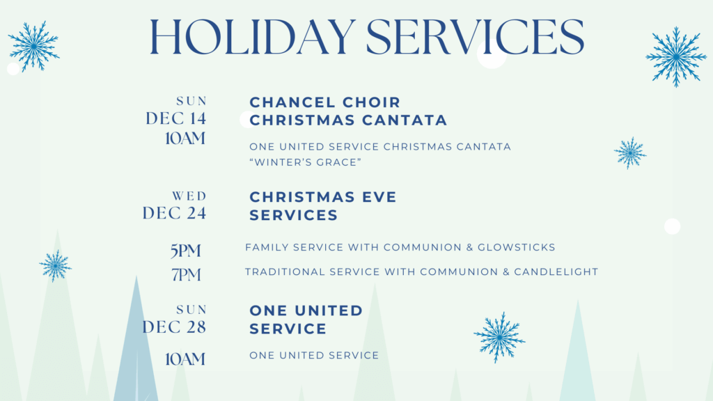 - Christmas Cantata: Join us on December 3 for the first Sunday in Advent, featuring the Christmas Cantata “A New and Glorious Morn” during our One United Worship Service at 10:00am.